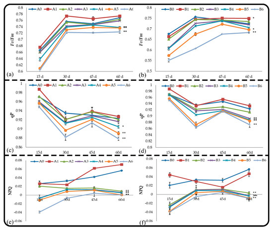 The photochemical quenching coefficient (qP) is the proportion of light energy absorbed by PSII antenna pigments for photochemical reaction electron transfer, that is, the proportion of excitation energy entering the photosynthetic electron-transport system through QA oxidation for photochemical assimilation. It is also a measure of the oxidation state of the primary electron acceptor QA, which reflects the relative number of PSII open centers. Larger qP values indicate a greater amount of QA- is reoxidized to QA and a higher probability of PSII electron transfer. Within 2 months, the effects of root and soil extract treatments on the leaf qP of M. hupehensis Rehd. seedlings were similar (Figure 4c,d); leaf qP first decreased, increased, and then decreased. Treatments A5, A6, B3, B4, B5, and B6 significantly inhibited leaf qP.
