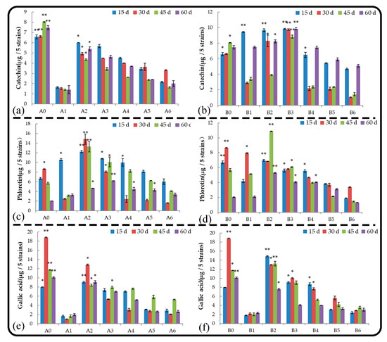 Catechins and their oxidation products are ternary compounds of carbon, hydrogen, and oxygen that are synthesized from sugars through a series of enzymes that mediate the formation of benzene-ring compounds through the shikimic acid pathway. Catechins are phenolic substances that can precipitate heavy metals and proteins [19]. Under normal growth conditions, catechin is the main substance secreted by the root system of M. hupehensis Rehd. seedlings in the late growth stage, and treatments B3, B4, B5, and B6 had no effect on catechin secretion; however, the other treatments promoted catechin secretion of the root system, as catechin was the main component secreted in the early growth stage of the root system (Figure 5a,b). Treatments B5 and B6 significantly inhibited the secretion of catechins in the roots of M. hupehensis Rehd. seedlings, and higher concentrations of leaching liquor resulted in a stronger inhibition of catechin secretion. There were significant differences in the effects of root and soil extracts applied at the same concentration on the catechin secretion of seedlings, and the amount of catechin secreted by the roots of seedlings treated with soil extracts was higher than that secreted by the roots of seedlings treated with root extracts.