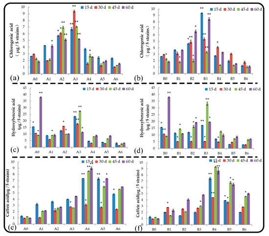 Chlorogenic acid is a depside formed by caffeic acid and quinic acid; it is a phenylpropanoid compound produced by the shikimate pathway during the aerobic respiration of plants. Under normal growth conditions, chlorogenic acid was the main substance secreted by the root system of M. hupehensis Rehd. seedlings during the early stage of growth (Figure 6a,b). Treatments A2 and B2 delayed the secretion of chlorogenic acid by the root system, and other treatments had no effect on chlorogenic acid secretion. Within 2 months, treatments A1, A2, and B3 significantly promoted the secretion of chlorogenic acid by roots, and the stimulatory effect first increased and then decreased with time; treatments A5, A6, and B6 significantly inhibited the secretion of chlorogenic acid by the roots. The amount of chlorogenic acid secreted by the roots of M. hupehensis Rehd. seedlings under each root extract treatment was higher than that under each soil extract treatment in the same low-concentration treatments, and the amount of chlorogenic acid secreted was lower in these treatments compared with the high-concentration soil extract treatments.