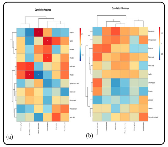 Correlations between seedling growth and phenolic acids of M. hupehensis Rehd. at different stages: 15 d (a) and 30 d (b). Note: * Correlation is significant at the 0.05 level, ** correlation is significant at the 0.01 level.