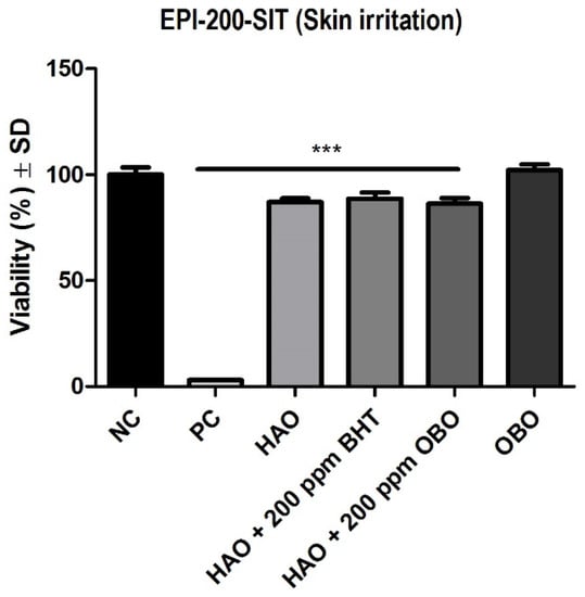 Viability of EpiDerm Skin Irritation Model (EPI-200 SIT) following application of the testes samples. One-way ANOVA followed by Dunnett’s multiple comparison test (*** p < 0.001) were applied. Statistical processing was performed using GraphPad Prism 5 software (San Diego, CA, USA). Negative control (NC) is represented by Dulbecco’s phosphate buffered saline (DPBS); positive control (PC) is represented by sodium dodecyl sulphate (SDS) 1%.