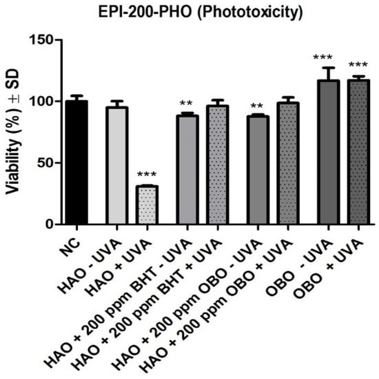 Viability of EpiDerm Phototoxicity Model (EPI-200-PHO) following application of the testes samples ± UVA exposure. One-way ANOVA followed by Dunnett’s multiple comparison test (** p < 0.01; *** p < 0.001) were applied. Statistical processing was performed using GraphPad Prism 5 software (San Diego, CA, USA). NC is represented by sesame oil.
