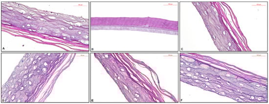 Histological aspects of EpiDerm Skin Irritation Model with the tested oil samples, hematoxylin-eosin (HE) staining: (A) NC group—normal histological structure, magnification ×40; (B) PC specimen—extensive necrosis, magnification ×40; (C) HAO specimen—discreet parakeratosis, magnification ×40; (D) HAO + 200 ppm BHT specimen—slight thickening of the stratum corneum, magnification ×40; (E) HAO + 200 ppm OBO specimen—mild parakeratosis, magnification ×40; (F) OBO specimen—slight increase of the granular layer cells, magnification ×40.