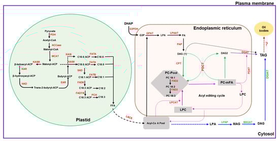 Plants accumulate oil primarily in the form of triacylglycerols (TAG) [1]. Triacylglycerols have nutraceutical value and are the main source of edible oils for households and industrial applications. With the increasing human population, the global consumption for vegetable oils has increased by >50% over the past decade and is expected to double by 2040 [2,3]. The enzymatic reactions for TAG biosynthesis in plants are well established with the pathways for fatty acid (FA) biosynthesis in the plastid followed by TAG formation in the endoplasmic reticulum (ER) (Figure 1). For the final step in TAG biosynthesis, in addition to the reaction catalyzed by diacylglycerol O-acyl transferase (DGAT) (Figure 1), an acyl-CoA-independent reaction is catalyzed by phospholipid:diacylglycerol acetyltransferase (PDAT) ([4,5] and citations therein). Further, a cytosolic pathway has been identified in groundnut [6].