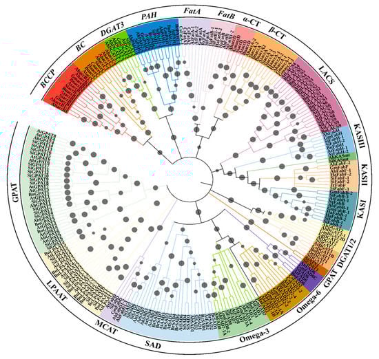 Circular dendrogram for the gene products involved in oil biosynthesis constructed using the N–J method with 10,000 bootstraps using MEGAv10 [27]. For accession number details of each gene product, please refer to Supplementary Table S1. Bootstrap values are represented by grey circles on the branches. The subfamily names of gene products are denoted on the outermost circle of the tree. Ah—Arachis hypogaea, At—Arabidopsis thaliana, Bn—Brassica napus, Br—Brassica rapa, Co—Camellia oleifera, Cs—Camelina sativa, Eg—Elaeis guineensis, Gh—Gossypium hirsutum, Gm—Glycine max, Ha—Helianthus annuus, Hi—Handroanthus impetiginosus, Ji—Jatropha curcas, Jr—Juglans regia, Muc—Macfadyena unguis-cati, Nt—Nicotiana tabacum, Oe—Olea europaea, Pf—Perilla frutescens, Rc—Ricinus communis, Sa—Striga asiatica, Sh—Salvia hispanica, Si—Sesamum indicum, Tm—Tropaeolum majus.