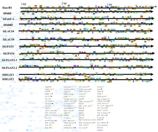 Based on the homology relationships for genes associated with oil biosynthesis in model plants and genotypes exhibiting higher oil yield, we have identified 12 genes in sesame that could be potential targets for enhancement in the sesame oil yield (Table 3). The upstream sequences (3 kb from the start codon) for each of the 12 genes were subjected to promoter analysis using the PlantCARE database to predict the potential regulatory features [36]. A total of 79 CAREs (cis-acting regulatory elements) were detected from the upstream sequences of the aforementioned 12 genes potentially targeted to improve oil yield (Figure 3; Table S3). Different TFs associated with FA biosynthesis regulation and TAG accumulation are well documented, including DNA binding with one finger (Dof), LEAFY COTYLEDON1 (LEC1), LEC2, sequences over-represented in light-induced promoters 5 (SORLIP5), AGAMOUS-LIKE15 (AGL15), BASIC LEUCINE ZIPPER 67 (bZIP67), SPATULA (SPT), WRINKLED1 (WRI1), MYB96, ABSCISIC ACID INSENSITIVE3 (ABI3), and FUSCA3 (FUS3) [37,38]. Of these 11 TFs, binding sites for TFs DOF, SORLIP5, AGL15, and LEC1 were identified in the promoter regions of all the 12 genes studied (Figure 4). Although the number of DOF binding sites is over-represented in all these promoters studied, the literature suggests that not all the AAG motifs in plant promoters are targets for the DOF domain containing proteins and are variably regulated [39]. DOF4 and DOF11 positively regulate ACCase and LACS and, thereby, increase seed oil content in Arabidopsis, while this negatively regulates CRA1, associated with seed storage protein [40]. LEC1 and LEC2 positively regulate WRI1 and AGL15, respectively [41,42]. WRI1 in turn positively regulates TAG biosynthesis through DGAT1 [43]. Our transcriptome analysis also revealed the higher expression levels of WRI1 (SIN_1023649), specifically in high oil yielding genotypes. Binding sites for MYB96, a positive regulator of seed oil accumulation and activator of the DGAT1 gene in Arabidopsis seeds [44], was detected in the upstream sequences of the SiDGAT2 and SiDGAT3 genes in sesame (Figure 4), but not in the SiDGAT1 gene. It is reported that MYB96 binds to the promoter of ABI4 and activates its expression [45], and ABI4 has been shown to directly regulate DGAT1 expression in Arabidopsis [46].