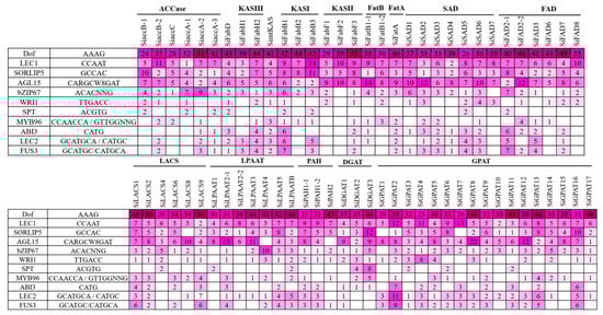 A total of 11 TFs were identified to be involved in regulating seed oil accumulation [37,38,40,138]. Potential TF binding sites in all retrieved promoters sequences were identified using PLACE [36] (http://www.dna.affrc.go.jp/PLACE/; accessed on 28 September 2022) and PlantPAN 3.0 [139] (http://plantpan.itps.ncku.edu.tw/index.html; accessed on 28 September 2022).