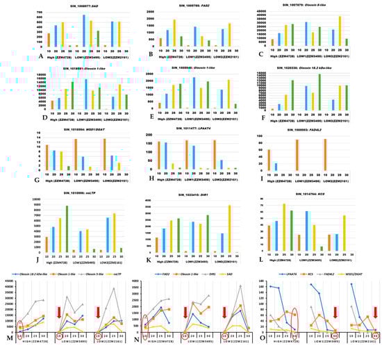 Expression profiles (in FPKM values, Y-axis) for key regulatory genes of oil biosynthesis in sesame using the transcriptome dataset of Wang et al. (2019). The X-axis represents the developmental stages in days post anthesis (DPA). (A): Sad; (B): Fad2; (C): Oleosin 5-like; (D): Oleosin 1-like; (E): Oleosin 1-like; (F): Oleosin 18.2 kDa-like; (G): Dgat; (H): Lpaat4; (I): Fad4L2; (J): nsLTP; (K): DIR1; (L): KCS; (M,N): Set of genes that are expressed significantly less at 10 DPA in both of the low oil yielding genotypes (indicated with a red colored down arrow at 10 DPA); (O): Set of genes that are significantly less expressed at 30 DPA in both of the low oil yielding genotypes (indicated with a red colored down arrow at 30 DPA).