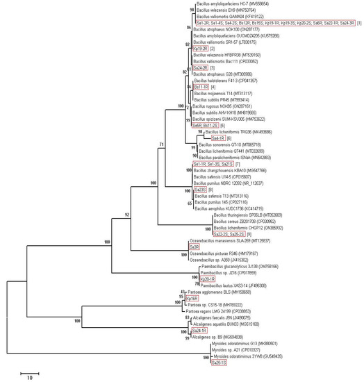 Most of the isolates (23 out of 28) were identified as Bacillus spp. At that, for some isolates, the nucleotide sequences of the 16S rRNA gene were absolutely identical. Therefore, we divided the isolates of the genus Bacillus into nine groups depending on the similarity of 16S rDNA (Table 2). Thus, group 1 contains 11 isolates having absolutely identical sequences of the 16S rRNA gene. On the same basis, the isolates Se5R and Bs11-2S were grouped into group 5, the isolates Se1-1R, Se1-3S, and Sa21S were grouped into group 7, and the isolates Sa22-2S and Sa25-2S were grouped into group 9. Each of the remaining isolates of the genus Bacillus has had different sequences of the 16S rRNA gene from the rest and is isolated in a separate group (groups 2–4, 6, 8). For each of the groups, representatives with the closest 16S rDNA sequences were identified in the GenBank database (Table 2). The phylogenetic analysis is presented in Figure 1. The remaining 5 isolates were identified as: Se3R—Oceanobacillus sp., Kp20-1R as Paenibacillus sp., Kp16R as Pantoea sp., Sa24-1R as Alcaligenes sp. and Sa25-1S—as Myroides sp. (Table 2, Figure 1).
