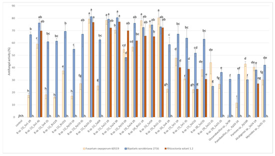 Antifungal activities (%) of endophytes against phytopathogenic fungi Fusarium oxysporum 60519, Bipolaris sorokiniana 2716, Rhizoctonia solani 1.2. Bars represent the mean ± SD of three different experiments, and different letters show a significant difference at the p ≤ 0.05 level, as determined by Duncan’s multiple test.
