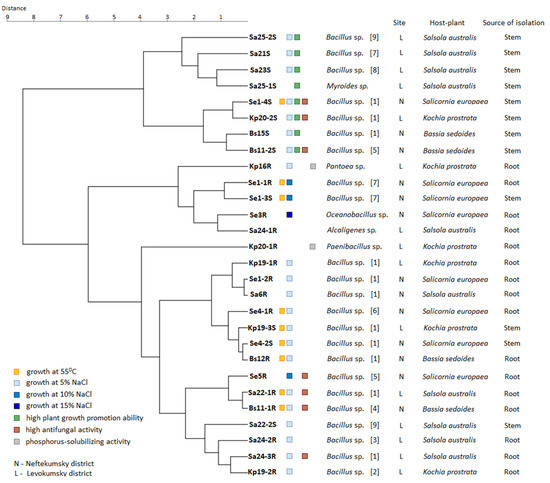 The polyphasic analysis did not show strict correlations between the phenotypic characteristics of the strains and their taxonomy, host plant, and geographical site. However, a number of interesting facts were revealed. Thus, most strains with resistance to high temperatures were isolated from Salicornia europaea L. (five of the nine strains). Also, all four strains with resistance to 10–15% NaCl were also isolated from the roots and stems of Salicornia europaea L. growing in the more saline soil in the Neftekumsky district. Such an effect was demonstrated by other researchers. For example, strains of Arthrobacter agilis, Bacillus endophyticus, Bacillus tequilensis, Planococcus rifietoensis, Variovorax paradoxus, and ISE-12 Pseudomonas sp., isolated from the halophyte Salicornia europaea L. were able to facilitate seed germination and seedling growth in the presence of growth inhibitory levels of salt [26,27]. A similar effect was demonstrated by the strain UAE 1 Micromonospora chelsea isolated from Salicornia bigelovii Torr. [28]. It can be assumed that Salicornia as a host plant attracts endophytes with the highest resistance to NaCl.
