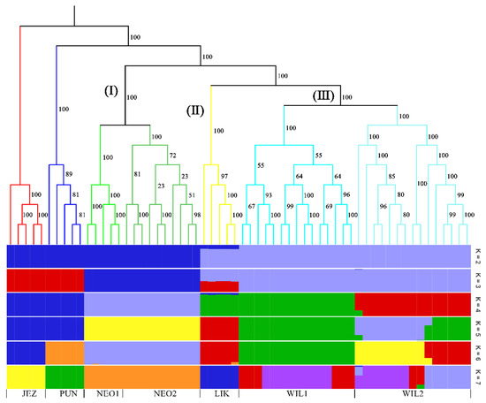 Population structure cluster analysis based on ADMIXTURE ver. 1.3.0 software (Alexander, CA, USA) [43] was used for samples of Picea with K values ranging from 2 to 7. PLINK ver. 1.90 software (Purcell, MA, USA) [44] was used to convert the data file, and cross-validation was applied to explore convergence and determine the optimum number of clusters. The genetic component coefficient (Q) of each material in each subgroup was used to construct the population genetic structure matrix.