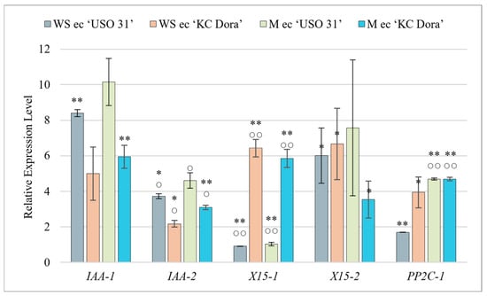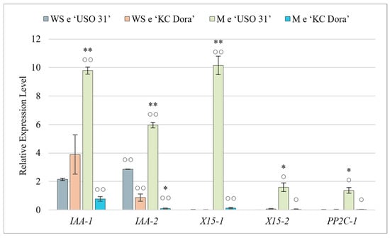 Quantification of relative expression of IAA-1, IAA-2, X15-1, X15-2, and PP2C-1 genes in walking stick (WS e) and matured embryos (M e) of two cultivars of Cannabis sativa ‘USO 31’ and ‘KC Dora’. Expression data were normalized using Act as housekeeping gene and calibrated relative to young leaves. Significant differences in gene expression in matured embryos (Table S2) are represented by asterisks (p ≤ 0.01 “∗∗”; p ≤ 0.05 “∗”) and between genotypes (Table S1) by circles (p ≤ 0.01 “○○”; p ≤ 0.05 “○”).
