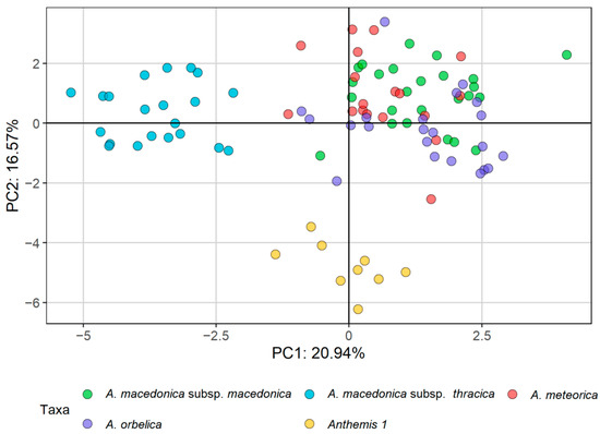 Τhe morphometric analyses that we used (principal components analysis, PCA; factor analysis on mixed data, FAMD; Figure 1 and Figure 2, respectively) indicated a clear distinction of Anthemis macedonica subsp. thracica and Anthemis 1 from the rest of the examined material, i.e., A. macedonica subsp. macedonica, A. meteorica and A. orbelica. This distinction was more evident in the FAMD, i.e., when evaluating both the qualitative and quantitative characters (Figure 2). In the same analysis, the group of A. meteorica was also defined, albeit remaining close to the macedonica subsp. macedonica–A. orbelica complex, which appeared coherent.