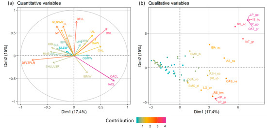 Relative contribution of the quantitative (a) and qualitative (b) morphological characters to the FAMD of Figure 5.