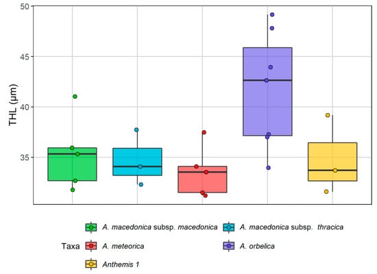 Box plots presenting the variation of the total haploid length (THL) in five different taxa of the Anthemis macedonica group. The coloured points present the individuals’ values for each taxon.