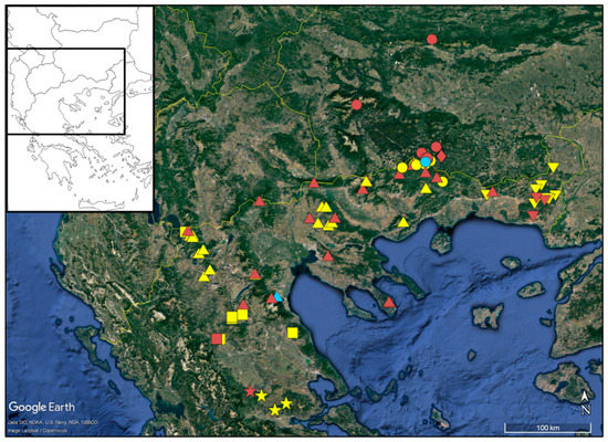 Distribution map of Anthemis macedonica group, showing the localities of the specimens collected by the authors (yellow and sky-blue colour) and those of the examined herbarium specimens (red colour). Triangles: A. macedonica subsp. macedonica; circles: A. macedonica subsp. orbelica; squares: A. meteorica; stars: A. serpentinica; reversed triangles: A. thracica; rhombus: A. macedonica subsp. stribrnyi; sky-blue triangle: possible hybrid between A. macedonica subsp. macedonica and A. meteorica; sky-blue circle: possible hybrid between A. macedonica subsp. orbelica and A. pindicola. (Background map data: Google, SIO, NOAA, U.S. Navy, NGA, GEBCO.)