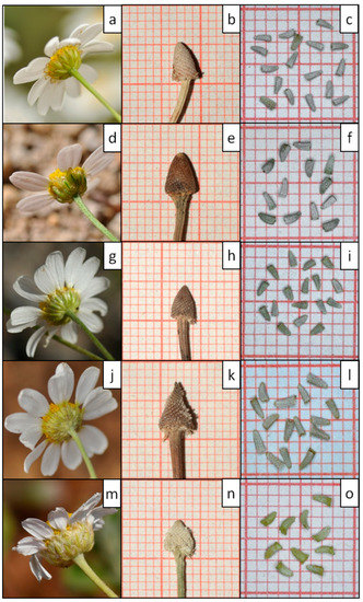 According to Fernandes [20], the diagnostic characters that keep the Anthemis macedonica group members coherent, despite their varying lifespan, are the very narrow leaf-lobes (less than 1 mm), the presence of numerous sessile glands in all parts of the plant, the quadrangular inner achenes and the granulate to tuberculate surface of at least the outer achenes. Still, some of these characters can be observed independently in other Anthemis species as well, mainly in members of section Hiorthia, while some show a great variability within A. macedonica and even overlap between the different taxa of this group.