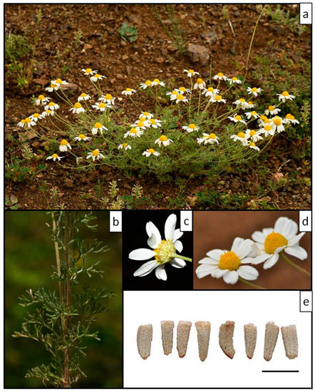 - Fernandes, R. Anthemis L. In Flora Europaea; Tutin, T.G., Heywood, V.H., Burges, N.A., Moore, D.M., Valentine, D.H., Walters, S.M., Webb, D.A., Eds.; Cambridge University Press: Cambridge, England, 1976; Volume 4, pp. 145–159. [Google Scholar]