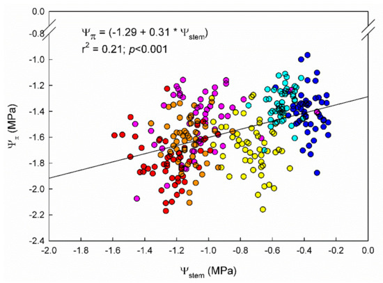 Fitted regression between stem water potential (Ψstem) and leaf osmotic potential (Ψπ) during 2020 and 2021 seasons in 9 “Grenache” clones grown in Mallorca, Spain. Colored dots depict the day of the year (DOY) of measurement (cyan: 206; orange: 240; blue: 138; yellow: 152; pink: 179; and red: 211).