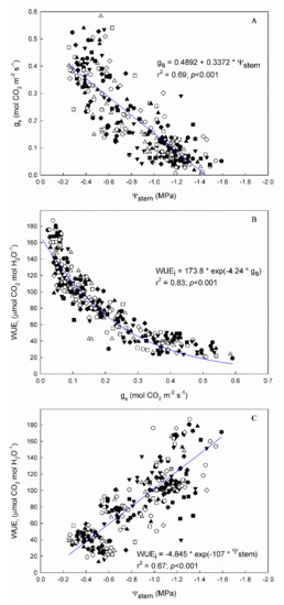 Linear relationships between (A) stomatal conductance (gs) and stem water potential (Ψstem), (B) intrinsic water use efficiency (WUEi) and gs, and (C) intrinsic water use efficiency (WUEi) and stem water potential (Ψstem) in the 9 “Grenache” genotypes in the 2 experimental seasons (2020 and 2021), in Mallorca, Balearic Islands, Spain.