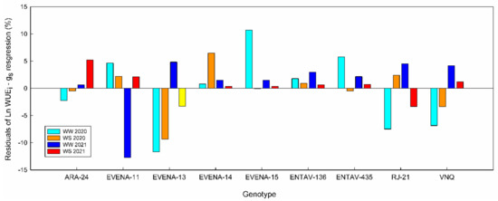Residuals of the water use efficiency over stomatal conductance (WUEi–gs) linearized regression for each “Grenache” genotype. Well-watered 2020 (cyan); water stress 2020 (orange); well-watered 2021 (blue); water stress 2021 (red).