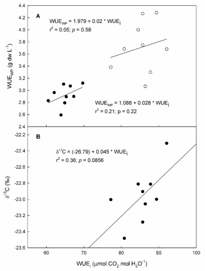 Relationship between intrinsic water use efficiency (WUEi) and (A) whole plant water use efficiency (WUEWP) and (B) carbon isotope ratio (δ13C) measured on 9 “Grenache” genotypes in 2020 (black dots) and 2021 (white dots).