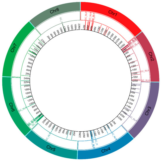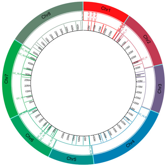 Distribution of cloned disease resistance gene homologs in Cardamine hirsuta (1st inner layer in their corresponding position in C. hirsuta genome). The tracks in the circos plot, from outer to inner, show chromosome (Chr) number and types of gene cluster. GC_NLR = gene cluster (GC) with all nucleotide-binding site leucine rice repeats (NLR) members, GC_RLP = GC with all receptor-like proteins (RLP) members, GC_RLK = GC with all receptor-like kinase proteins (RLK) members, GC_H = GC with members are a mixture of NLR, RLK and/or RLP, Chr = chromosome and M = position in million base pairs.