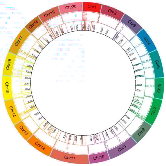 Distribution of cloned disease resistance gene homologs in Camelina sativa (1st inner layer in their corresponding position in C. sativa genome). The tracks in the circos plot, from outer to inner, show chromosome (Chr) number and types of gene cluster. GC_NLR = gene cluster (GC) with all nucleotide-binding site leucine rice repeats (NLR) members, GC_RLP = GC with all receptor-like proteins (RLP) members, GC_RLK = GC with all receptor-like kinase proteins (RLK) members, GC_H = GC with members are a mixture of NLR, RLK and/or RLP, Chr = chromosome and M = position in million base pairs.