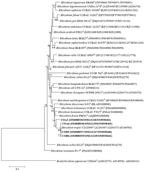 All rhizobial isolates produced effective symbiosis with sunnhemp plants. Previous studies have shown that C. juncea establishes symbiotic associations with rhizobia belonging to Bradyrhizobium [27,28] and Methylobacterium [29] genera in West Africa. Strains of Rhizobium sp. have been previously isolated from root nodules of Crotalaria species but were unable to nodulate this plant [33]. To our knowledge, this is the first report on strains of R. tropici nodulating C. juncea, and the sequencing of the nodC gene revealed that all native rhizobial strains belonged to symbiovar tropici of the genus Rhizobium. The symbiovar tropici is composed of strains of R. tropici, R. leucaenae, R. lusitanum, and R. freirei, and has been found in America, Africa, and Asia [34,35]. R. tropici has a broad host range and can nodulate several legumes including P. vulgaris, Leucaena leucocephala, and Macroptilium atropurpureum due to the existence of different nod genes in its genome [6]. In the tropics, inoculants containing R. tropici are efficient for beans due to its high tolerance to stressful conditions and genetic stability [36,37]. Of note, the concatenated recA, atpD, and glnII gene phylogenies showed that strain COA3 had similarity values lower than 97% with R. tropici CIAT 899T and could represent new lineages within the genus Rhizobium. However, this should be further studied by conducting a polyphasic taxonomic analysis.