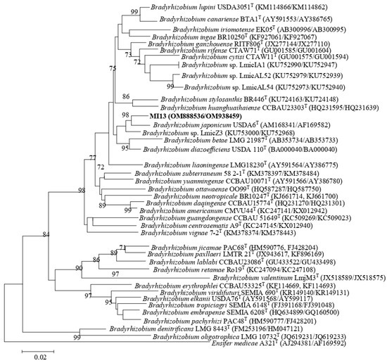A phylogenetic tree showing the relationship between the nodC genes from COA3, COA6, COB5, and COB6 strains and other rhizobial species revealed that all four strains belonged to symbiovar tropici of the genus Rhizobium with identities higher than 99% (Figure 3; Supplementary Table S2). Strain MI13 formed a cluster with B. yuanmingense CCBAU10071T based on the sequences of the nodC gene with 99.9% identity (Figure 4; Supplementary Table S2). This cluster is phylogenetically divergent to that formed by the Bradyrhizobium symbiovars defined to date (Figure 4).