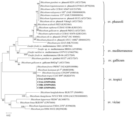 The phylogenetic trees inferred from sequences of the nifH gene revealed that strains COA3, COA6, COB5, and COB6 grouped with R. tropici CIAT 899T, R. multihospitium CCBAU 83401T, and R. lusitanum P1-7T with identity values higher than 99% (Supplementary Figure S4; Supplementary Table S2), and that the strain MI13 clustered with B. daqingense CCBAU 15774T, B. huanghuaihainense CCABU 23303T, B. ottawaense OO99T, B. liaoningense LMG 18230T, and B. japonicum USDA6T with identity values of 99.9% (Supplementary Figure S5; Supplementary Table S2).