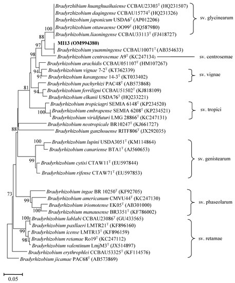 - Vinuesa, P.; Rojas-Jiménez, K.; Contreras-Moreira, B.; Mahna, S.; Prasad, B.N.; Moe, H.; Selvaraju, S.B.; Thierfelder, H.; Werner, D. Multilocus sequence analysis for assessment of the biogeography and evolutionary genetics of four Bradyrhizobium species that nodulate soybeans on the Asiatic continent. Appl. Environ. Microbiol. 2008, 74, 6987–6996. [Google Scholar] [CrossRef]