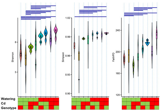 Diversity indices in rhizosphere microbiomes of SGE and SGECdt plant genotypes under different combinations of abiotic stress factors. For the color scheme, see caption of Figure 1. Blue lines connect values with significant differences.