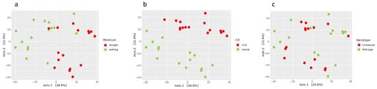 β-diversity of rhizosphere microbiomes after ilr transformation and ordination using a Euclidian metric colored according to watering regime (a), cadmium supplement (b), and plant genotype (c). Axes are percentages of variance explained. For the color scheme, see caption of Figure 1.