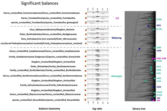 Statistically significant taxonomic balances related to watering regime, cadmium supplement, and plant genotype. Taxonomy of balances reflects the last identified rank. Binary tree does not reflect real genetic distances, only hierarchy. For the color scheme of log ratios, see caption of Figure 1.
