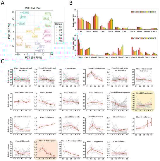 Metabolite accumulation for the 23 classes in leaf stages from C1 to C5. (A) PCA analysis of the 449 identified metabolites. Mix 01–03 were the three quality control samples. (B) Metabolite abundance of the 23 classes indicated by the added-up peak areas of compounds within each class. (C) Relative accumulation trends for compounds of the 23 classes. The trends were reflected by standardized peak areas (mean peak area of each stage/mean peak area of the five stages). Each gray line represents the trend for one individual compound. The red lines represent the combined trends of the compounds from each class. Class 12 (Phenolic acids) and Class 20 (Anthocyanins) were highlighted by yellow and pink shades, respectively. All values are expressed as means ± SE, n = 3. The significant differences for adjacent stages are indicated by asterisks at p < 0.05 (*) and p < 0.01 (**).