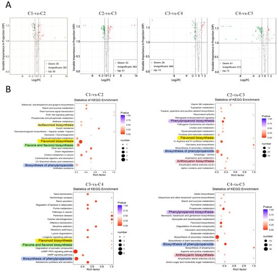 With the criteria of |log2FC| ≥ 1 and VIP ≥ 1, the differential metabolites (DMs) between adjacent leaf stages were screened. A total of 170 substances accumulated differentially in at least one of the four comparison groups (C1-vs-C2, C2-vs-C3, C3-vs-C4, and C4-vs-C5). The 170 DMs belong to all classes, except Class 14 (Quinones) and Class 18 (Isoflavones), which had only trace quantities indicated by their low peak areas. The status of DMs is shown in volcano plots (Figure 3A). There were 60 DMs in C1-vs-C2 (30 up and 30 down), 84 DMs in C2-vs-C3 (31 up and 53 down), 41 DMs in C3-vs-C4 (15 up and 26 down), and 74 DMs in C4-vs-C5 (13 up and 61 down). C4-vs-C5 group contained the highest proportion of down-DMs, indicating that many metabolites have higher contents in young leaves than in mature leaves.