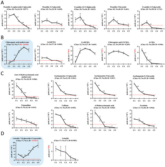Relative accumulation trends for metabolites of the 23 classes were shown by standardized peak areas (mean peak area of each stage/mean peak area of the five stages) (Figure 2C). Within each class, the general trend (shown by the red line) was the same as that in Figure 2B, while the trends of individual compounds (shown by the gray lines) varied greatly. The Class 12 (Phenolic acids, highlighted by yellow shade), containing the main reported functional CQA phenolics, showed a combined upward trend, contrary to the gradual decline in antioxidant activities along leaf development (Figure 1E), possibly due to effects of some individual compounds. For Class 20 (Anthocyanins, highlighted by pink shade), the five individual anthocyanins have similar trends: C2 > C1 > C3 > C4 > C5, with the highest content in C2. Then, anthocyanin content dropped significantly from C2 to C3, consistent with fading of the red color in mature leaves.