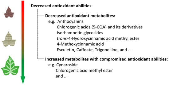 The other eight screened compounds have R > 0.9 and were highly expressed in young leaves and then declined during leaf development. These eight compounds include three isorhamnetin glycosides, four simple phenols, and one alkaloid, and were all reported to be functional phytochemicals. “Isorhamnetin glycosides” were demonstrated to had higher DPPH radical scavenging ability than ascorbic acid [18]. “Caffeate”, “trans-4-hydroxycinnamic acid methyl ester”, and “4-methoxycinnamic acid” are all derivatives of cinnamic acid and have been attributed to similar pharmacological effects as CQAs, such as antioxidants, antimicrobials, and protection of the liver and heart [19,20,21,22]. By replacing the hydroxyl group of trans-4-hydroxycinnamic acid with a methoxyl group, “4-methoxycinnamic acid” was derived, although with weakened antioxidant capacities [20]. “Esculetin (6,7-dihydroxycoumarin)”, a bioactive coumarin derivative, also possesses various pharmacological activities against obesity, diabetes, renal failure, thrombosis, and cardiovascular disorders [23]. Esculetin was determined to be an effective radical scavenging substance under UV radiation and was recommended to be used in cosmetics to prevent photo-aging [24]. For the alkaloid “trigonelline”, studies showed it results from the detoxification of excessive nicotinic acid, and it can play a key role in subcellular energy metabolism as an NAD reserve [25,26]. The above studies also agree that trigonelline mainly accumulated in juvenile tissues, such as embryos and young leaves, which is in accordance with our data.
