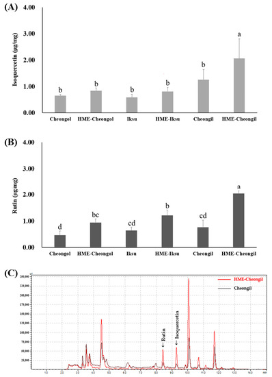(A) Isoquercetin and (B) rutin contents of mulberry leaf and HME-ML extract; and (C) HPLC chromatogram of rutin and isoquercetin in Cheongil and HME-Cheongil extract. Data are expressed as mean ± standard deviation (n = 3). Means with different letters vary significantly with Duncan’s Multiple Range Test (DMRT) at 5% level (p < 0.05) within samples.