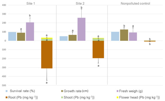 Survival rate (%), growth rate (cm), total fresh weight (g), and concentration of Pb (mg kg−1) in roots, leaves, and flower heads of H. petiolaris plants growing on the Pb-polluted sites (1 and 2) and the nonpolluted control site. Error bars are S.E. (n = 6). Values in the lines followed by the same letter and color are not significantly different at p ≤ 0.05 by ANOVA and Tukey test.