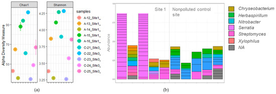 (a) Shannon index and Chao diversity analysis of the Illumina Miseq™ reads obtained from the rhizoplane samples of H. petiolaris plants growing on the polluted site 1 and the unpolluted control site 3. Five replicates per site are represented in separate circles. (b) The abundance of the most abundant genus-level ASVs from a total of 274 genus-level ASVs detected. Five replicates per site are represented in separate bars.