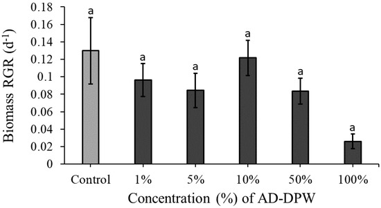 Mean (±SE) RGR (d−1) of Lemna minor cultivated on AD-DPW at 1%, 5%, 10%, 50%, and 100% concentrations in one-week experiments, as well as a control treatment. “a”: Denoting no significant difference was detected through post hoc analysis.