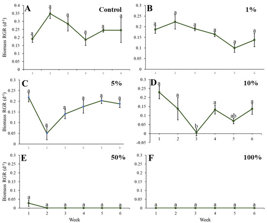 Mean (±SE) RGR (d−1) of Lemna minor growth for the control treatment (panel (A)), as well as on 1%, 5%, 10%, 50%, and 100% AD-DPW (panel (B–F), respectively) over the course of the six successive weeks. Different letters within each panel denote statistical differences between weeks. For individual weeks, RGR was greater for plants grown on the control (half-strength Hutner’s medium), 1%, 5%, and 10% concentrations than for duckweed cultivated on 50% and 100% concentrations: week 1 (all p < 0.05), week 2 (all p < 0.05), week 3 (all p < 0.01; except the 10% solution, p > 0.05), week 4 (all p < 0.01), week 5 (all p < 0.01), week 6 (all p < 0.01).
