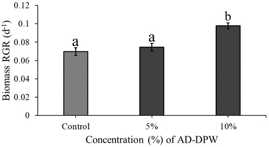 Mean (±SE) RGR (d−1) for Lemna minor grown on the control medium (half-strength Hutner’s medium), 5% and 10% AD-DPW in the semi-outdoor, recirculating system. Bars that do not share the same letter significantly differ from one another for p < 0.001, as per the post hoc test.
