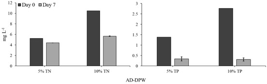Comparison of the total nitrogen (TN) and the total phosphate (TP) concentration (mg L−1) on day 0 and day 7 of L. minor growth, when cultivated on 5% or 10% AD-DPW (mean ± SE). For all treatments, the total nitrogen or total phosphate concentration was significantly lower on day 7 than on day 0 (p < 0.05).