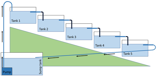 Lemna minor was cultivated in non-sterile, semi-outdoor, recirculating systems (n = 3). Each system consisted of five tiered tanks (21.5 cm length × 15.5 cm width × 11 cm height) and a lower sump tank (37 cm × 29 cm × 52 cm) with a capacity of 35 L per system (Figure 5). The five tanks had a combined total surface area for duckweed growth of 0.165 m2. The growing medium was pumped from the sump tank to the highest-tiered tank (1.1 L h−1: JYC-2000 Jiayaocheng, Ltd., Foshan, China) at a slow pace to minimise plant disruption [37]. All other tanks were sequentially gravity fed from the top tank and effluent from the lowest tank was returned to the sump tank. Filters inserted into the outlet pipe of each tank prevented movement of L. minor between tanks, whilst allowing the continued circulation of the medium. A muslin cloth cover was suspended above the three recirculating systems to provide 50% shading from natural sunlight. A preliminary assessment indicated that L. minor grew better at a reduced light intensity rather than in direct sunlight. The mean (± SE) light intensity experienced by L. minor between dawn and dusk was 139.9 ± 11.9 µmol m−2 s−1, with a min–max of 2.9–463.2 µmol m−2 s−1 (measured using HOBO MX2202, Onset).