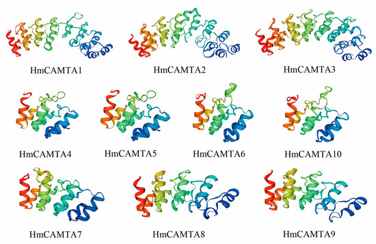 The secondary structure of HmCAMTA was analyzed (Table 2): The secondary structure of HmCAMTA (HmCAMTA3, 4, 5, 7, 8, 9, 10) proteins was mainly alpha helix, accounting for 70%, followed by random coil, and then extended strand, with the least beta rotation. The secondary structure of the other 3 HmCAMTA (HmCAMTA1, 2, 6) proteins was mainly alpha helix, accounting for 30%. Next was random crimping, followed by extended strand, and the beta rotation was the least. Figure 1 showed that random curl and alpha helix played a major role in maintaining tertiary structure stability while beta rotation played a major role in modification. The genetic relationships of HmCAMTA1, HmCAMTA2, and HmCAMTA3 were close, and the tertiary structure models of proteins were highly similar. The tertiary protein structures of HmCAMTA4, HmCAMTA5, HmCAMTA6, and HmCAMTA10 were highly similar. And the tertiary protein structures of HmCAMTA7, HmCAMTA8, and HmCAMTA9 were also highly similar.