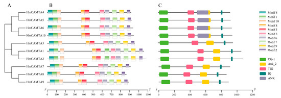 Phylogenetic tree (A), protein motif structure (B) and domain (C) analysis of HmCAMTA gene family. And the modules of different colors represent different motifs or domains.